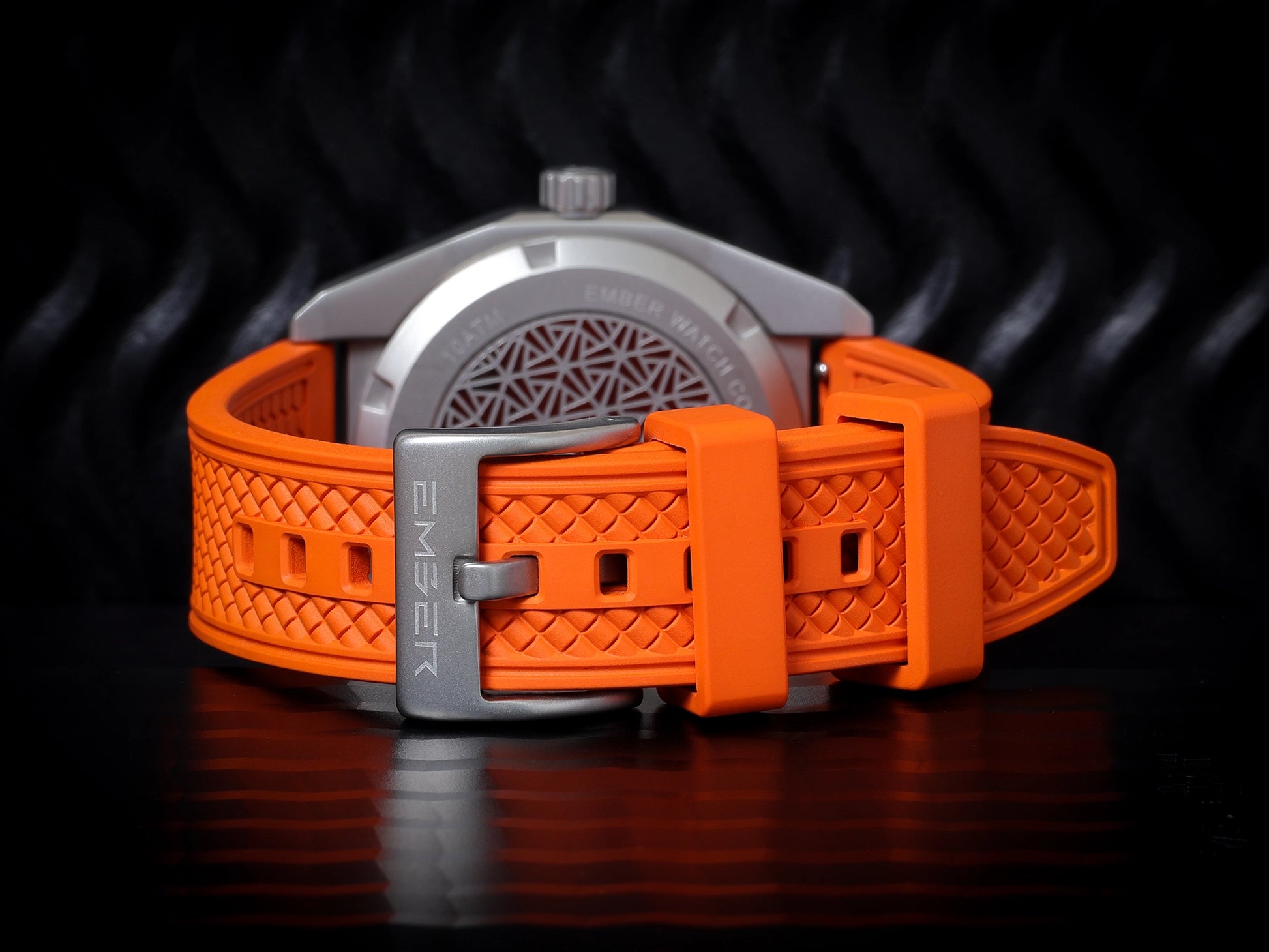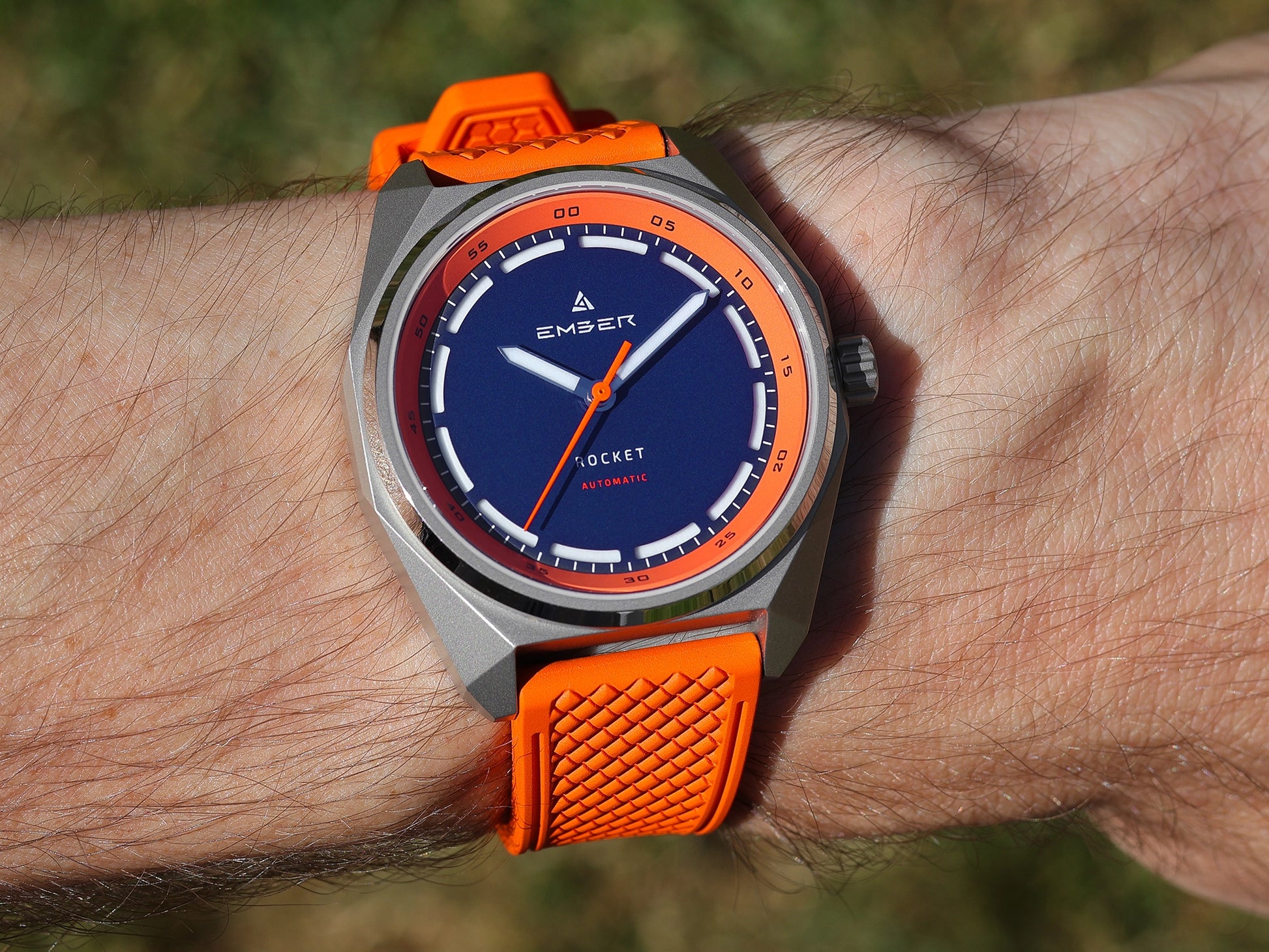 Supple FKM rubber with a branded buckle in a bead-blasted finish to match the Rocket's case.